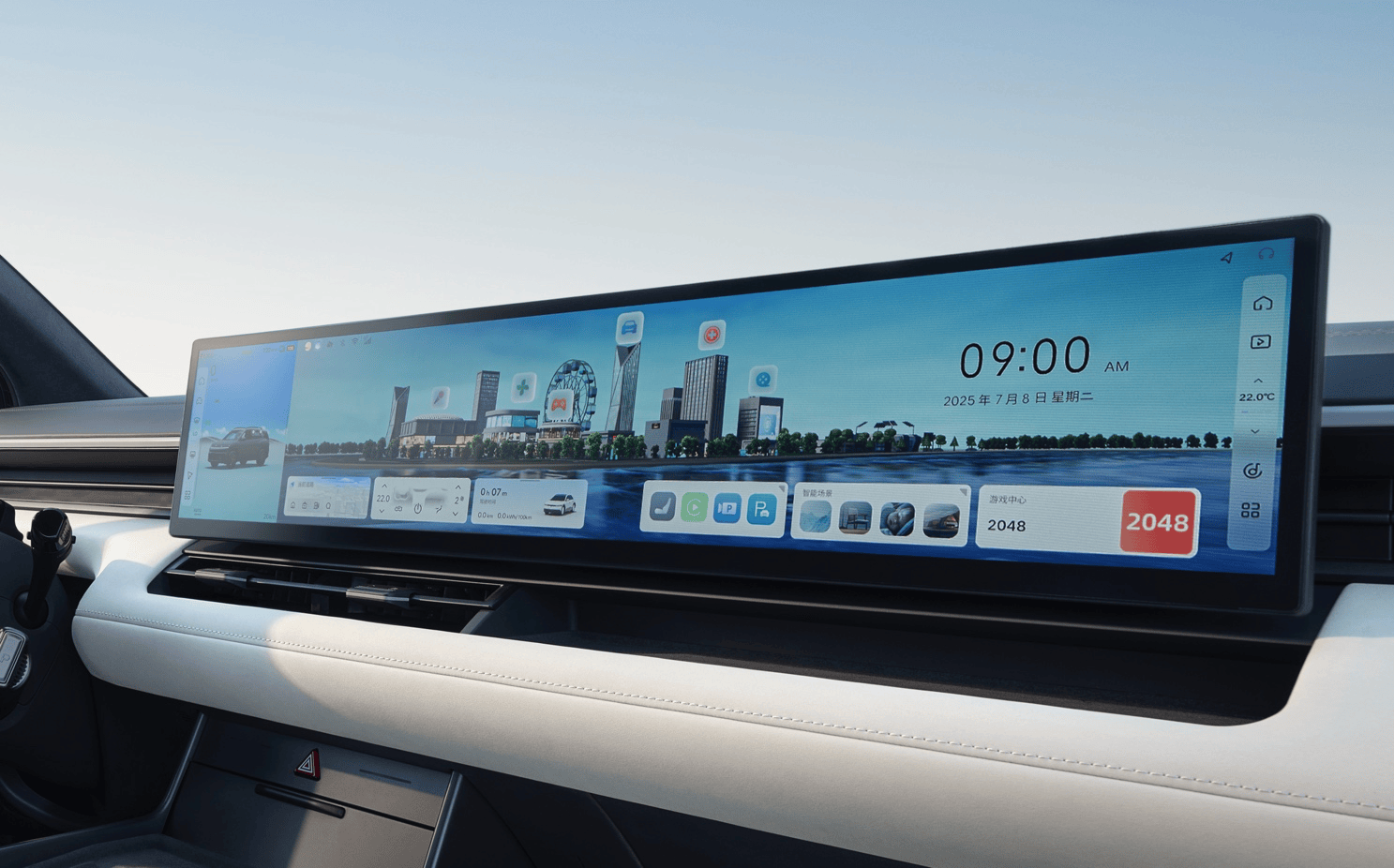 車輛配備了一塊27英寸超薄寬幕顯示屏,具備4K高清分辨率和1000cd/m²的高亮度。即使在強光下,屏幕內(nèi)容依然清晰可見。這塊屏幕的鎂合金外殼在保證強度的同時,實現(xiàn)了同級別最薄的形態(tài),科技感十足。