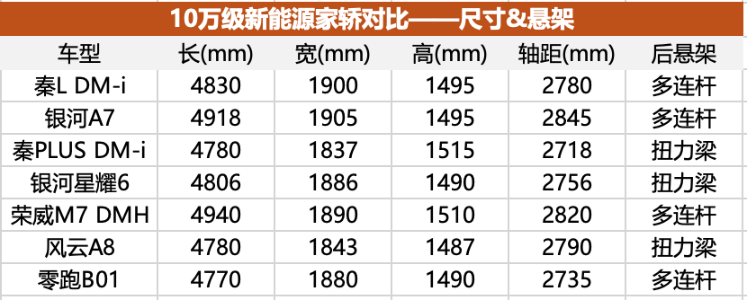 如上表,秦L DM-i、銀河星耀6,都是車長超4米8的A+級、或準B級轎車,銀河A7、榮威M7 DMH則超過了4米9,已經(jīng)達到了B+、或準C級的體量。