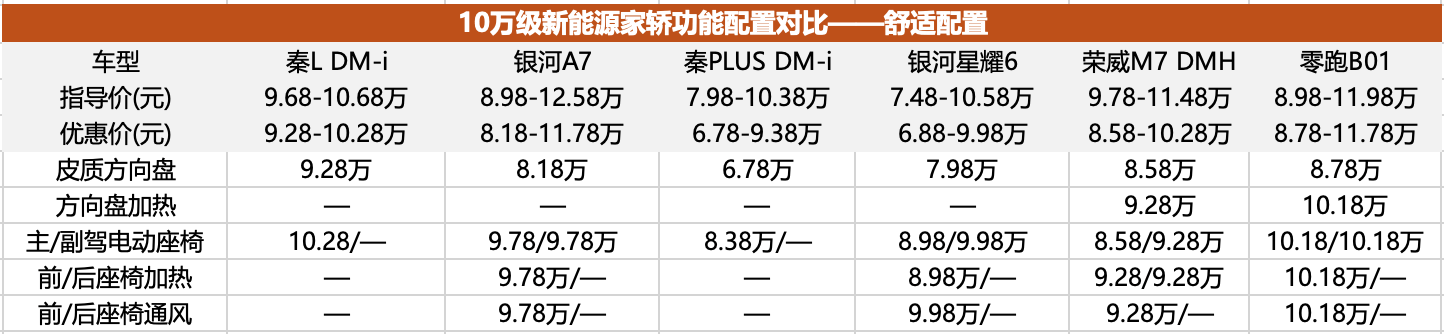 首先是電動座椅調(diào)節(jié),新款秦L DM-i和秦PLUS DM-i,在中高配上給到了主駕電動座椅,副駕只支持手動,吉利旗下的銀河A7、星耀6,及榮威M7 DMH,在10萬內(nèi)都具備主、副駕電動調(diào)節(jié)。