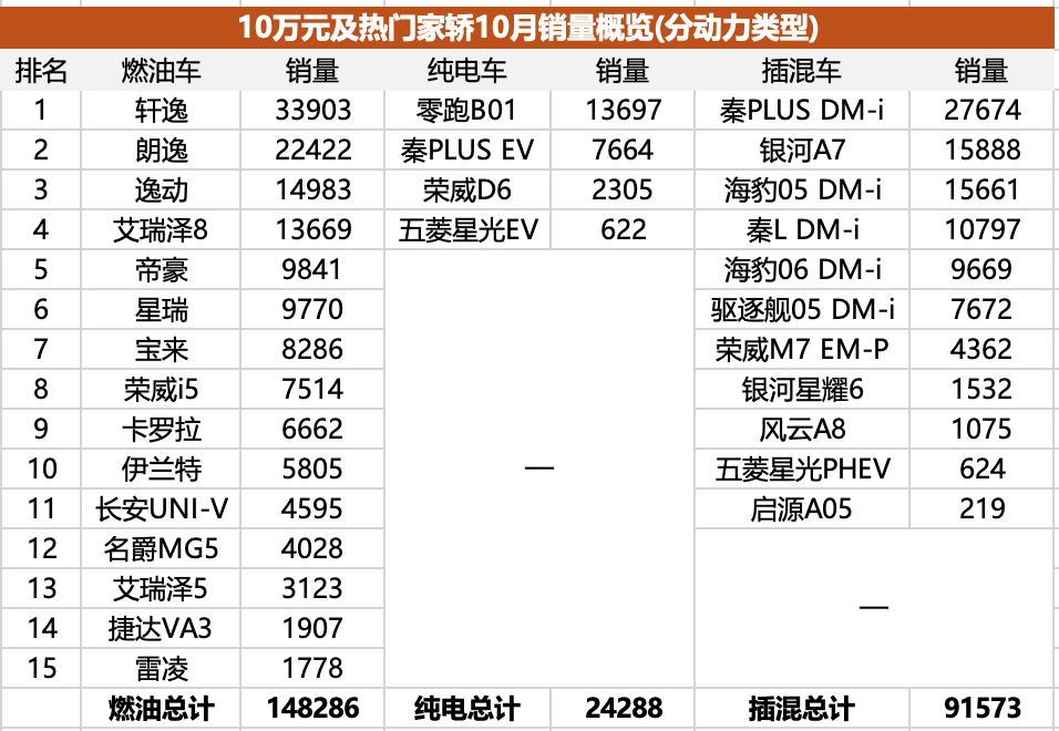 至于純電類別,上市不久的零跑B01,是目前唯一破萬的車型,而這款車10月份的銷量,就占據(jù)了10萬級純電三廂車6成份額。