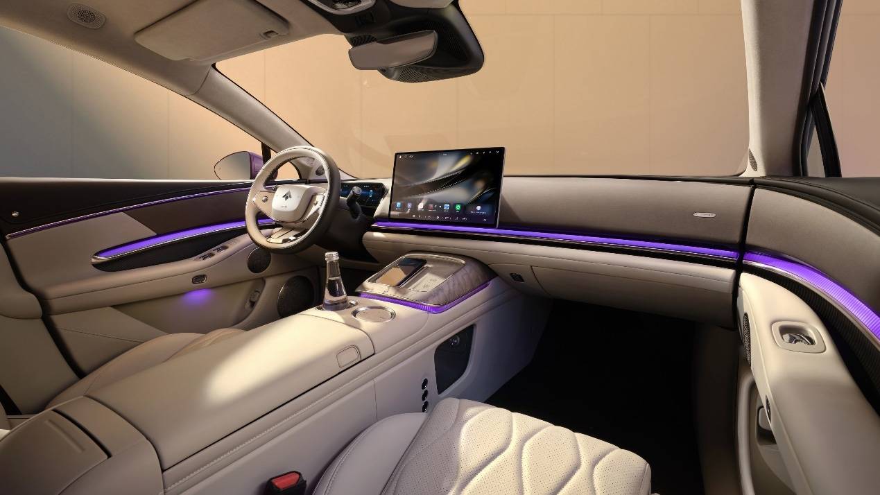 先來(lái)看設(shè)計(jì),A800采用了名為“星際流體”的設(shè)計(jì)語(yǔ)言,外觀上最引人注目的是長(zhǎng)達(dá)6米的貫穿式星環(huán)燈帶和全球首創(chuàng)的三面式翻轉(zhuǎn)大燈,儀式感和辨識(shí)度都很高。其溜背造型不僅動(dòng)感,還將風(fēng)阻系數(shù)降低至0.21Cd。