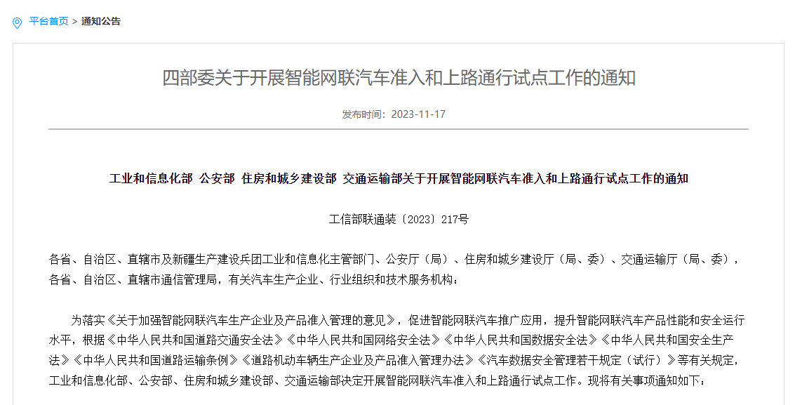 2023年11月18日,工信部發布《關于開展智能網聯汽車準入和上路通行試點工作的通知》,明確參與試點的智能網聯汽車搭載的自動駕駛功能是指國家標準《汽車駕駛自動化分級》(GB/T 40429-2021)定義的3級駕駛自動化(有條件自動駕駛)和4級駕駛自動化(高度自動駕駛)功能。
