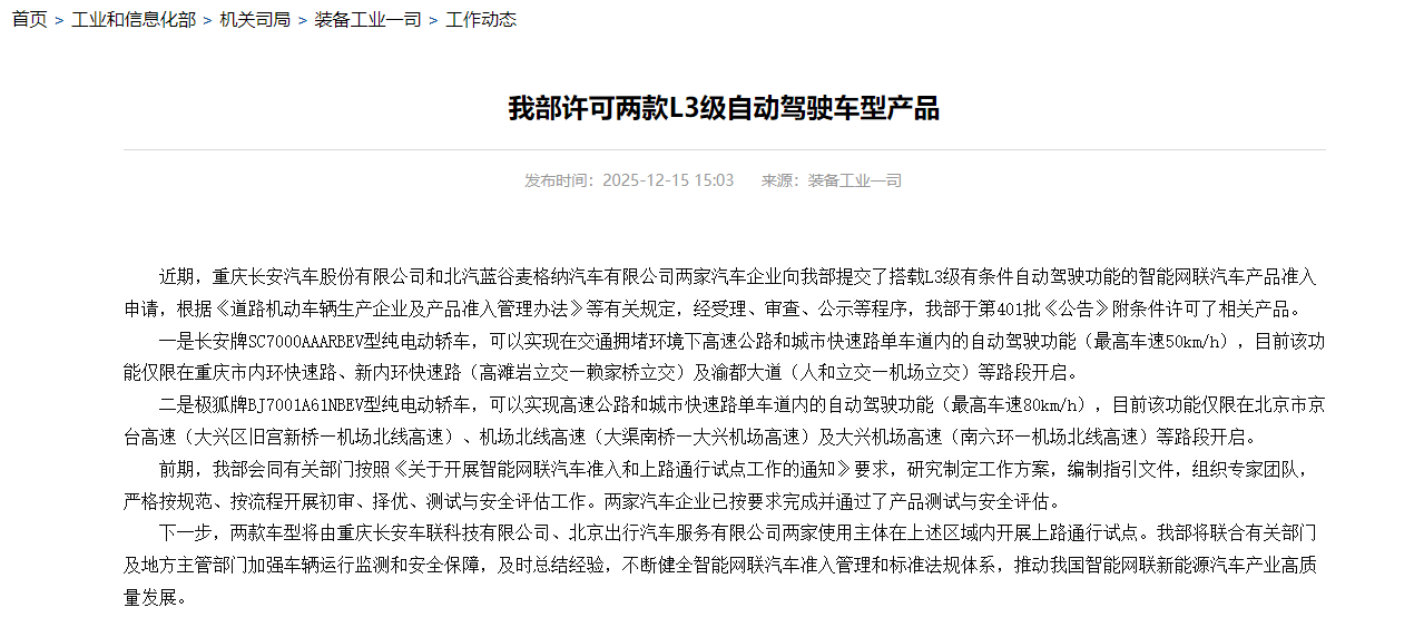 12月16日,“北汽藍谷”漲停,“長安汽車”罕見大漲,兩支A股股票的異動,均是在前一日盤后工信部發布了一則消息——“我部許可兩款L3級自動駕駛車型產品”后發生的。這很容易讓人想到二者之間是有關聯的,也在一定程度上表明,“L3”備受期待、工信部的“許可”極具意義。