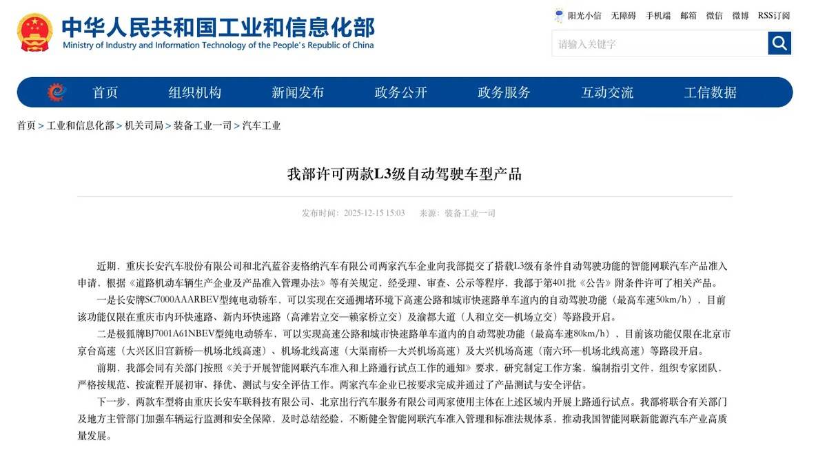 另一個大事,則是L3級自動駕駛在中國開始正式開始破冰。12月15日,工業和信息化部正式發放首批L3級有條件自動駕駛(以下簡稱L3級自動駕駛)車型準入許可,長安汽車旗下深藍SL03與北汽極狐兩款車型入選,分別獲準在重慶、北京指定路段開展試點運行。這標志著L3級自動駕駛從測試階段邁入商業化應用,也讓長期模糊的自動駕駛責任界定、技術路線選擇等行業核心議題迎來明確答案。