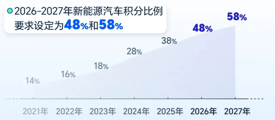 同時,在政策層面,2026年實(shí)施的《乘用車燃料消耗量評價方法及指標(biāo)》被稱為“最嚴(yán)油耗標(biāo)準(zhǔn)”,通過差異化考核和全周期監(jiān)管,倒逼車企加快新能源轉(zhuǎn)型,2026年車企新能源積分比例需達(dá)48%,2027年升至58%,進(jìn)一步強(qiáng)化了新能源的發(fā)展導(dǎo)向。