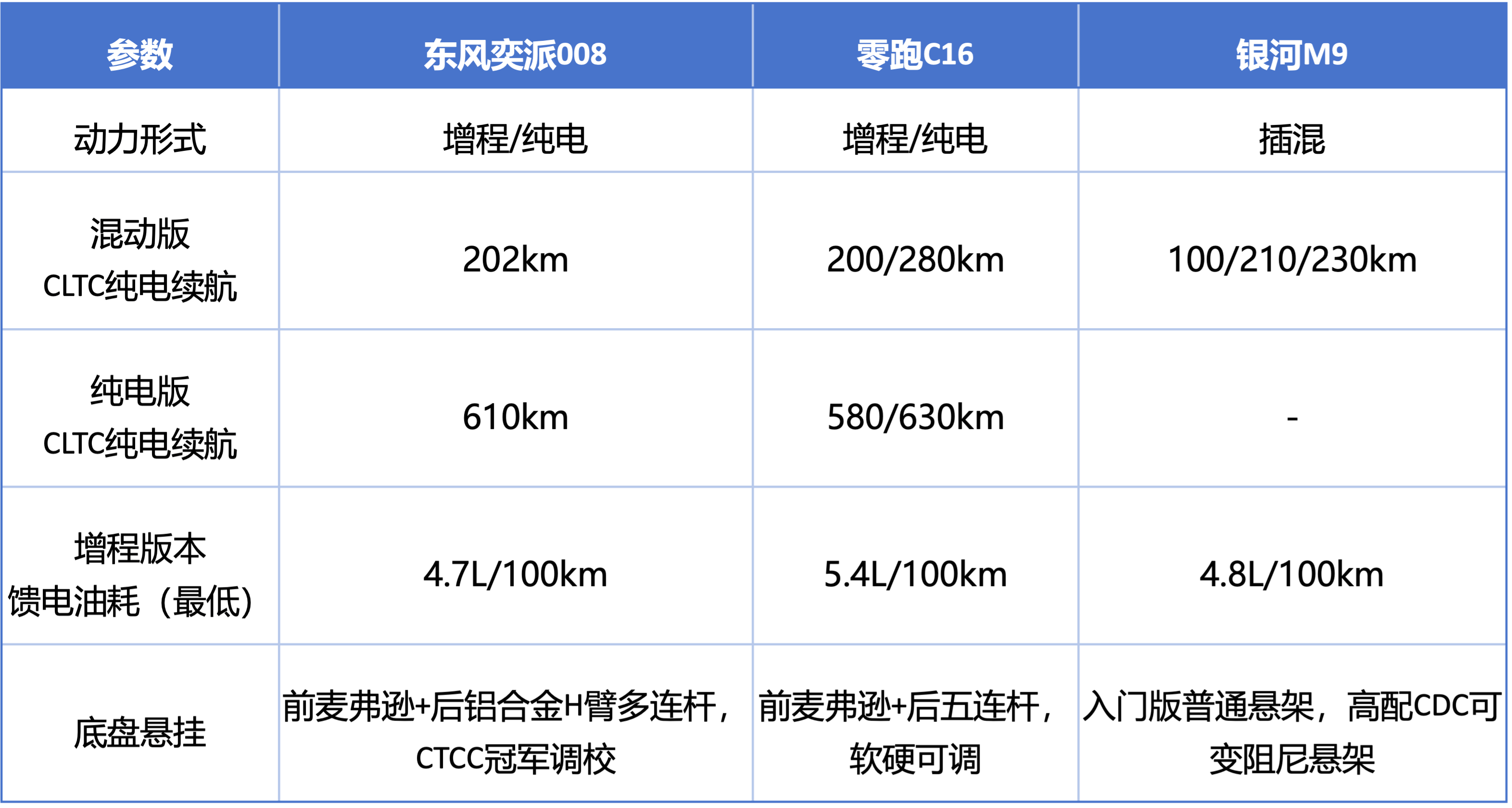 而在主流15-20萬級的熱門中大型新能源SUV里,東風奕派008、零跑C16、銀河M9都是家庭用戶的心頭好,三款車都沖著家用而來的。