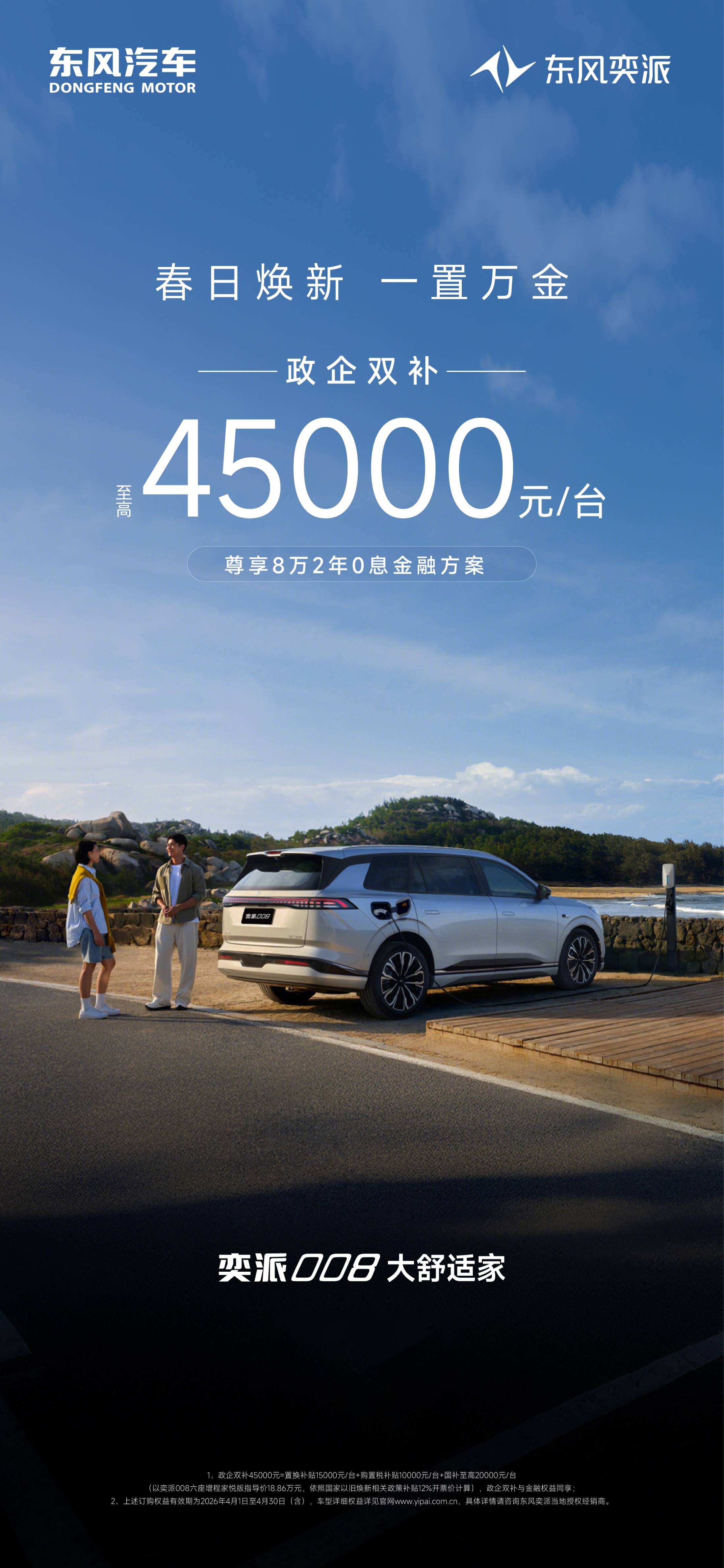 更重要的是,現在2026款東風奕派008還有限時購車權益,福利超給力!當前政企雙補至高45000元(含置換、購置稅、國補),搭配8萬2年0息,購車無壓力,出行更從容。