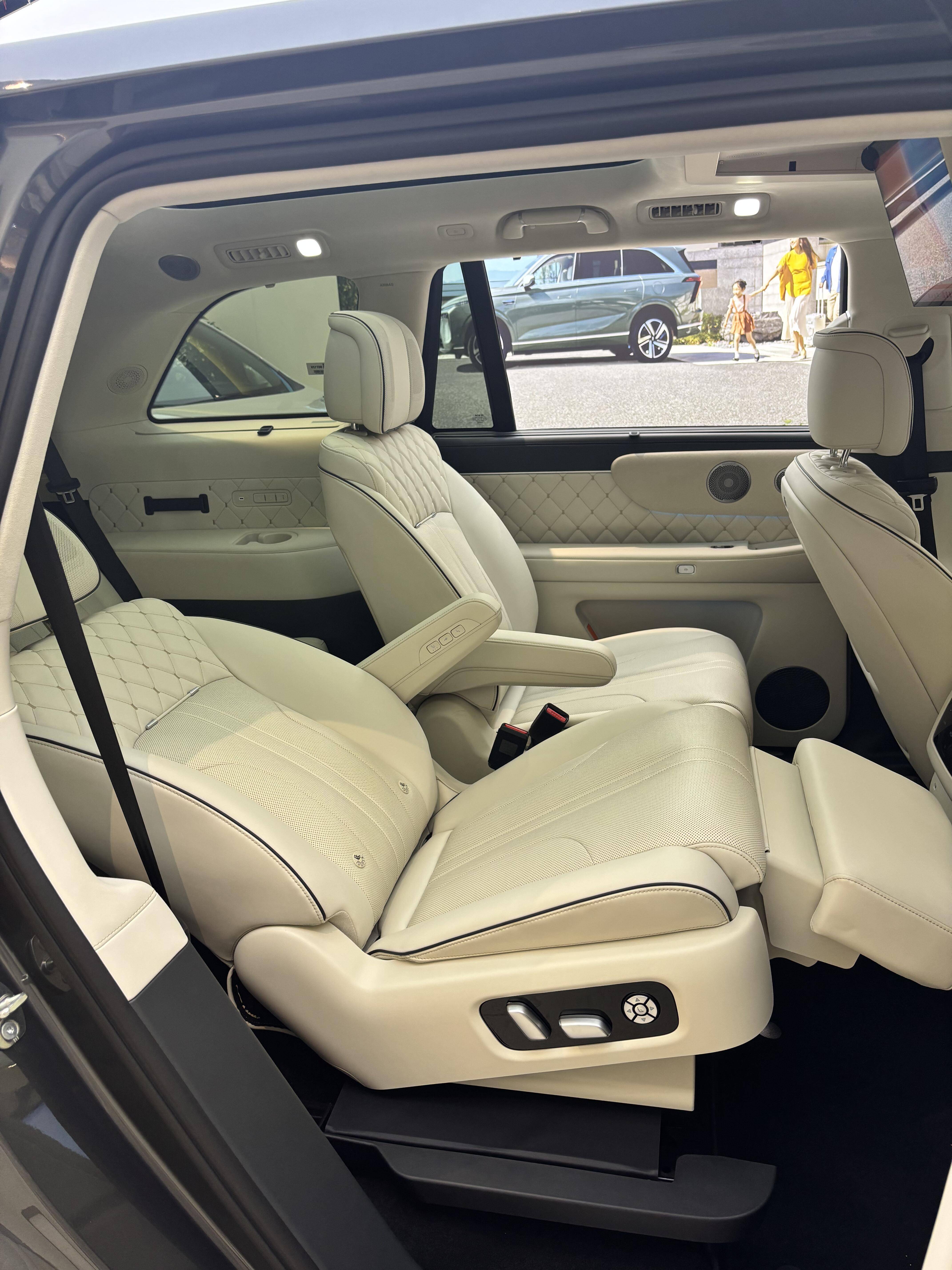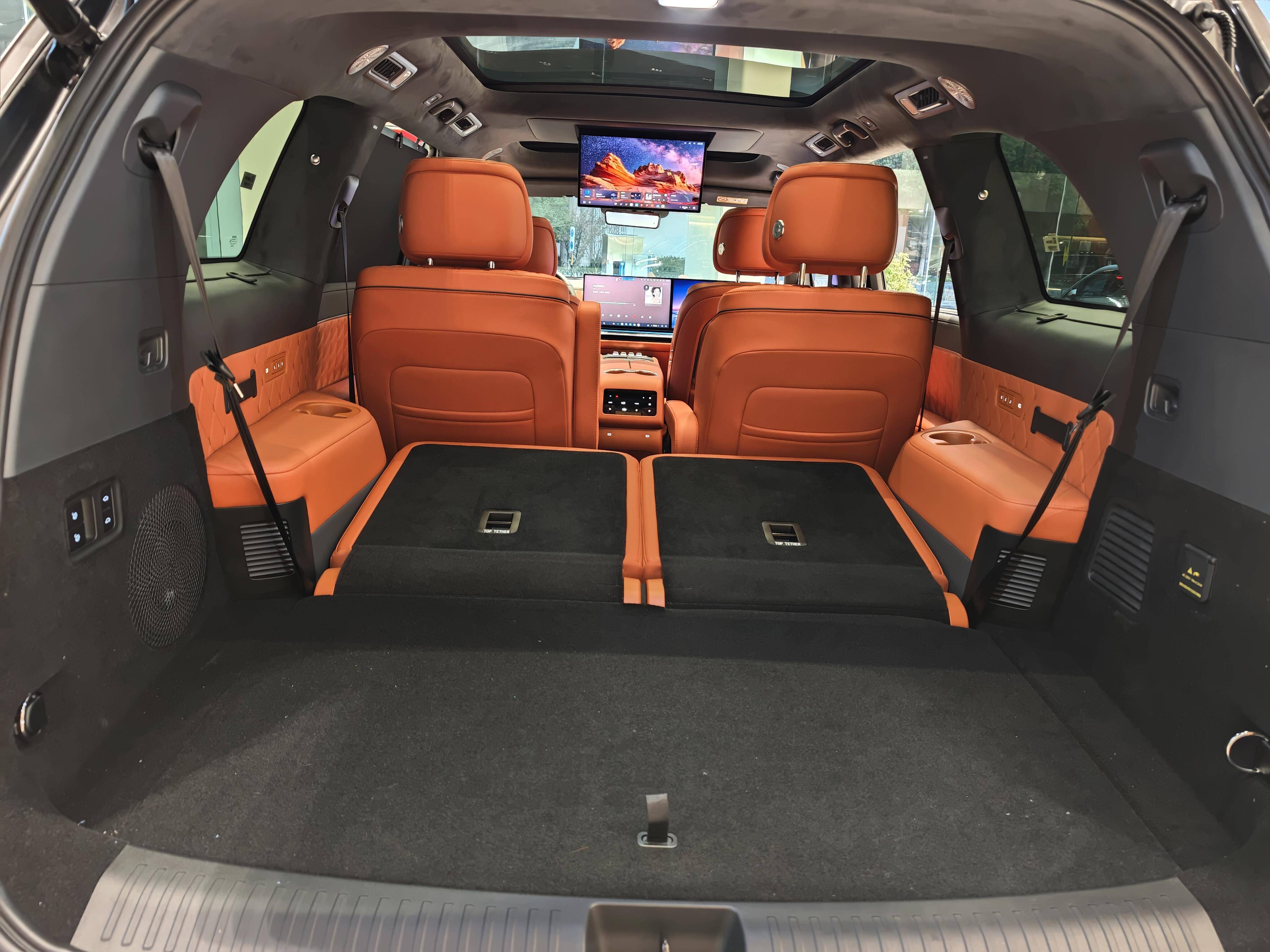 車內采用大六座布局,二排右側為帶電動腿托的零重力座椅,并支持通風/加熱以及22點按摩等功能,加之21.4英寸4K吸頂娛樂屏、折疊小桌板、31揚Coffee Al Sound音響系統(tǒng)等,保證乘坐舒適性。同時,副駕及二排門板上均提供50W手機無線充電面板,一二三排也均有遮陽簾,一二排還提供上車拉手。而第三排還有吧臺式大扶手+綁帶杯架,座椅也支持電調、加熱以及放倒等功能。