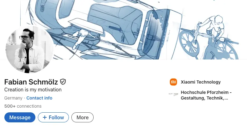據(jù)媒體報(bào)道,前蘭博基尼設(shè)計(jì)師 Fabian Schmölz 更新領(lǐng)英資料,顯示其已正式加入小米汽車。領(lǐng)英信息表明,F(xiàn)abian Schmölz 自 2025 年 4 月起擔(dān)任小米汽車歐洲外觀設(shè)計(jì)主管,工作地點(diǎn)位于德國(guó)巴伐利亞州施瓦布明興。?