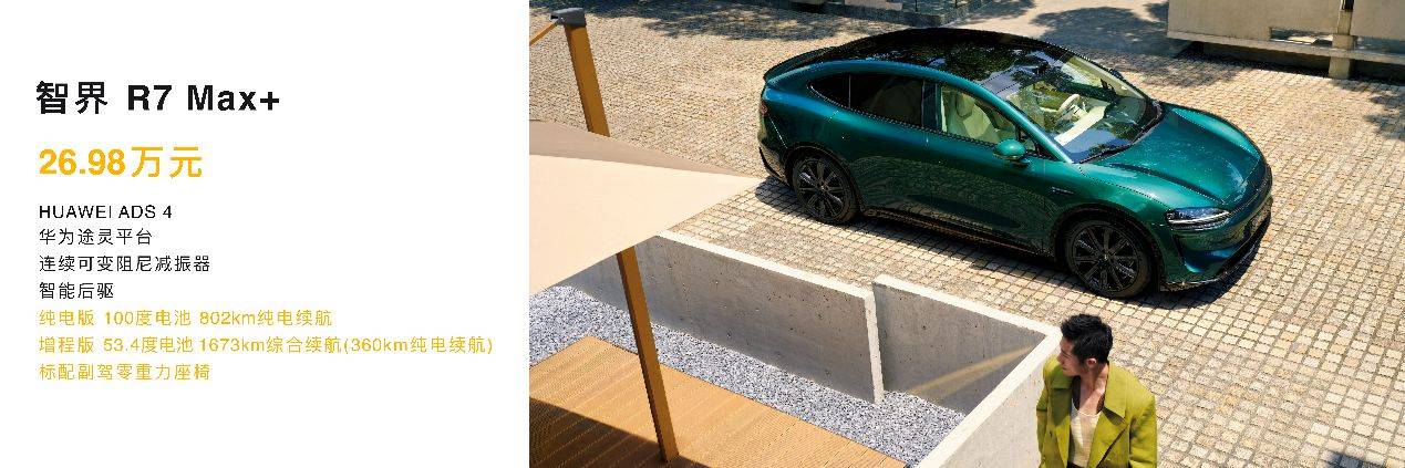 新款智界R7 Max+版售價26.98萬元,較Max版高出2萬元,主要升級在,純電版換裝100度電池,續航802km。而增程版本電池擴容至53.4度,純電續航達360Km,進一步緩解里程焦慮。此外,Max+版副駕零重力座椅極大提升了乘坐舒適性與豪華體驗。若您經常長途出行,或副駕常陪伴家人,Max+版的續航提升與舒適享受,顯然而見尤為超值。
