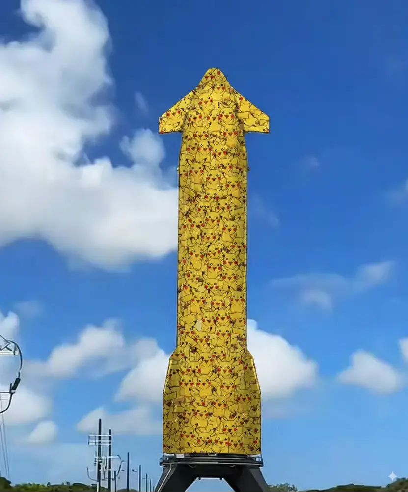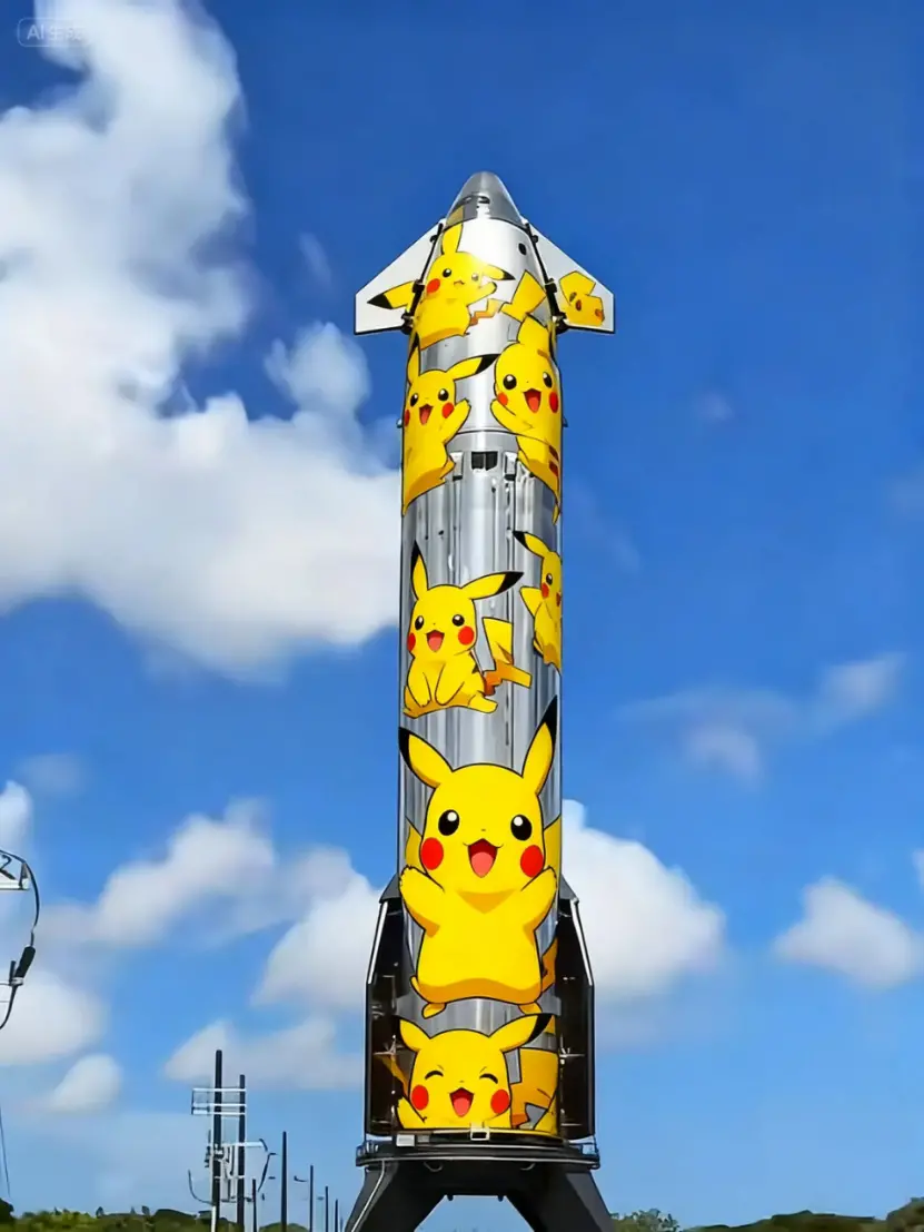 下面這具有視覺沖擊力的是Nano Banana生成的,比卡丘貼的嚴絲合縫。能看得出來,“比卡丘”和“星艦”都是Nano Banana舒適區內的元素,它能生成視覺沖擊力極強的畫面。