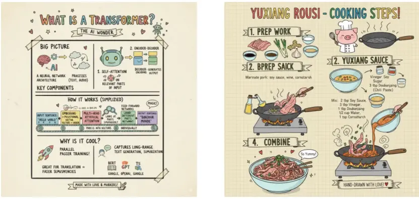 Prompt:手帳手繪風格,介紹Transformer是什么?魚香肉絲怎么做?