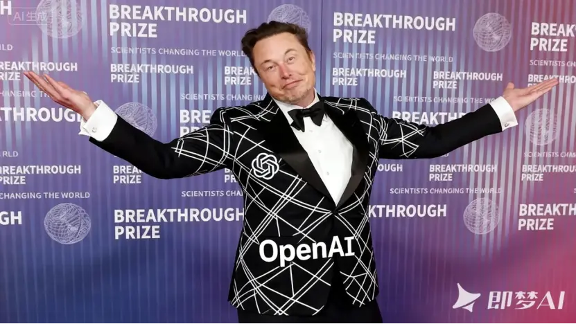 二者相比,硬要說的話,即夢4.0將OpenAI元素融入Elon Musk的西服后,產生的效果看起來更有設計感一些,但是像是西服的袖口位置,并沒有被渲染到: