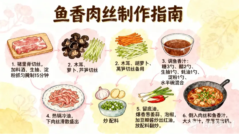 尤其是下面的魚香肉絲制作指南,看得出來對細節的把控很到位,整體所有食材的手繪圖細節都還不錯。