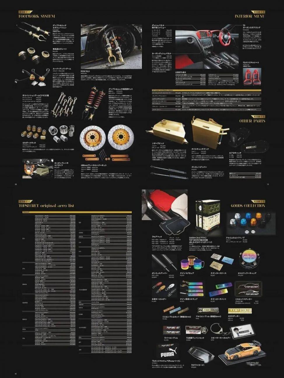 Top Secret 以奪人眼球的金色為代表色,其業務多元化,產品涵蓋引擎蓋上的機械鎖、剎車皮等各種汽車零部件,尤其擅長引擎調整,推出了多種引擎使用的改裝件,如進氣風隔、大口徑節氣門、渦輪強制進氣等。