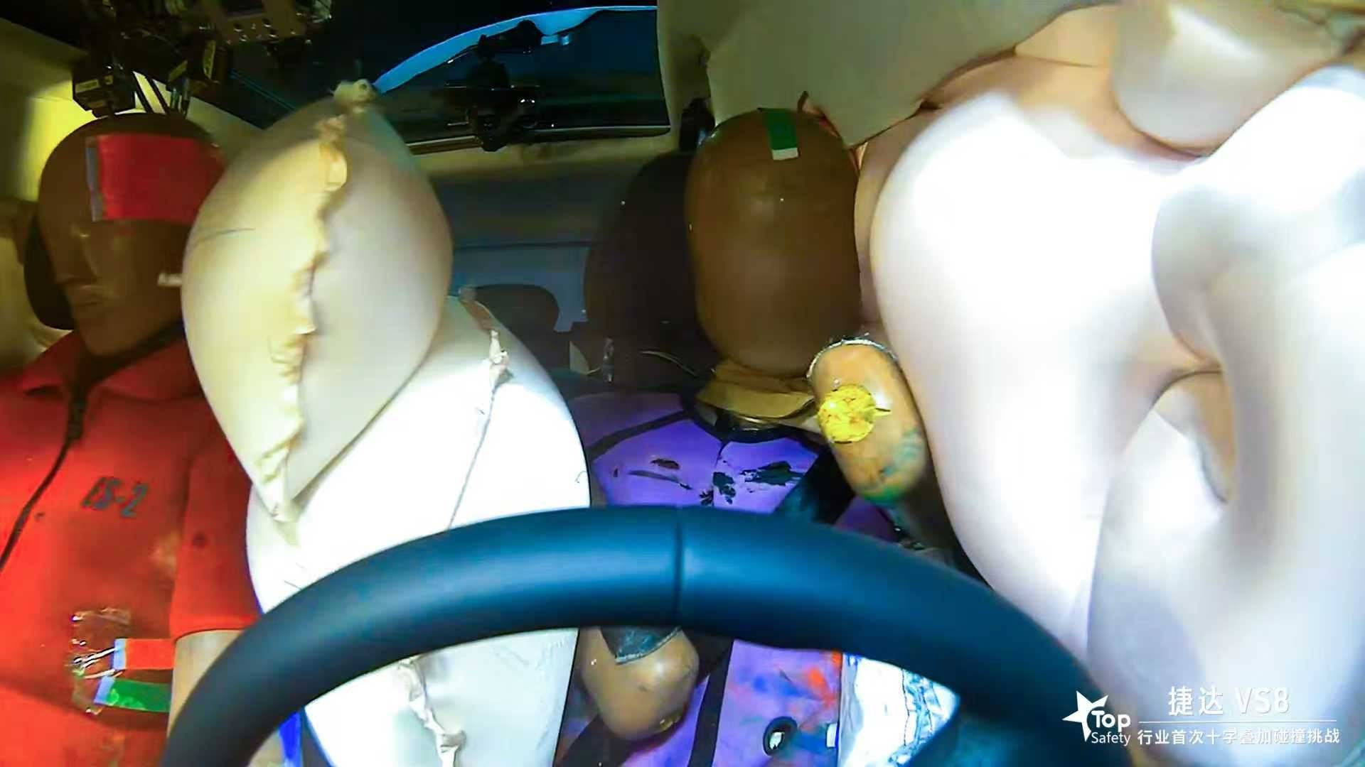 當捷達VS8遭遇第一次追尾撞擊時,車輛安全帶迅速發揮約束作用,有效固定乘員身體,減少前傾幅度,為乘客提供初步的安全保障。緊接著,捷達VS8又被撞擊駕駛員一側時,車輛的約束系統迅速響應,中央氣囊、側氣囊和側氣簾及時彈開,形成全方位的緩沖保護,進一步減輕碰撞對乘員的傷害。