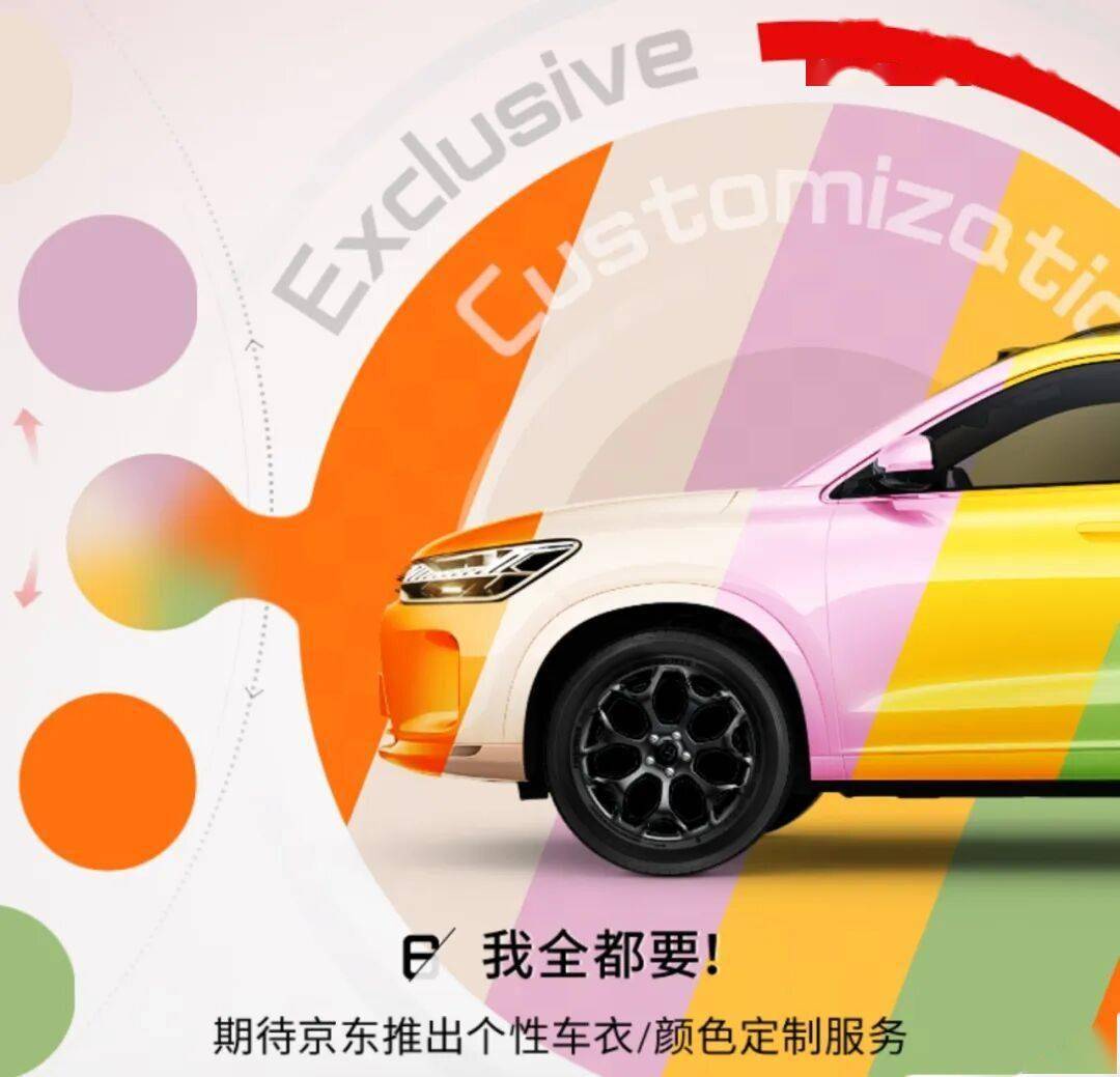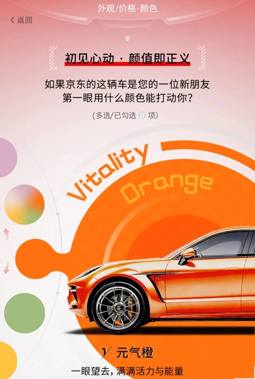 在官方的預熱內容里,我們也看到了其推出的定制頁面。首先是顏色, 提供了橙色、綠色、黃色、米白色、紫色以及全都要的選項,可以預估其未來這款車型的顏色選擇會比較的豐富,京東可能也會提供有車衣/顏色定制的服務。