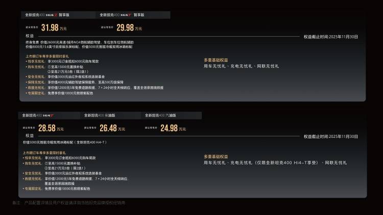 此次全新400構(gòu)建了覆蓋汽油、柴油、超級(jí)電混的全動(dòng)力產(chǎn)品矩陣,精準(zhǔn)匹配不同用戶的使用需求,售價(jià)區(qū)間24.98萬元-31.98萬元,其中汽油版24.98萬元、柴油版26.48萬元;Hi4-T版28.58萬元;Hi4-T智享版29.98萬元;Hi4-Z智享版31.98萬元。發(fā)布會(huì)當(dāng)日,長(zhǎng)城汽車董事長(zhǎng)魏建軍向AG超玩會(huì)夢(mèng)淚完成新車交付,實(shí)現(xiàn)“上市即交付”的服務(wù)承諾。