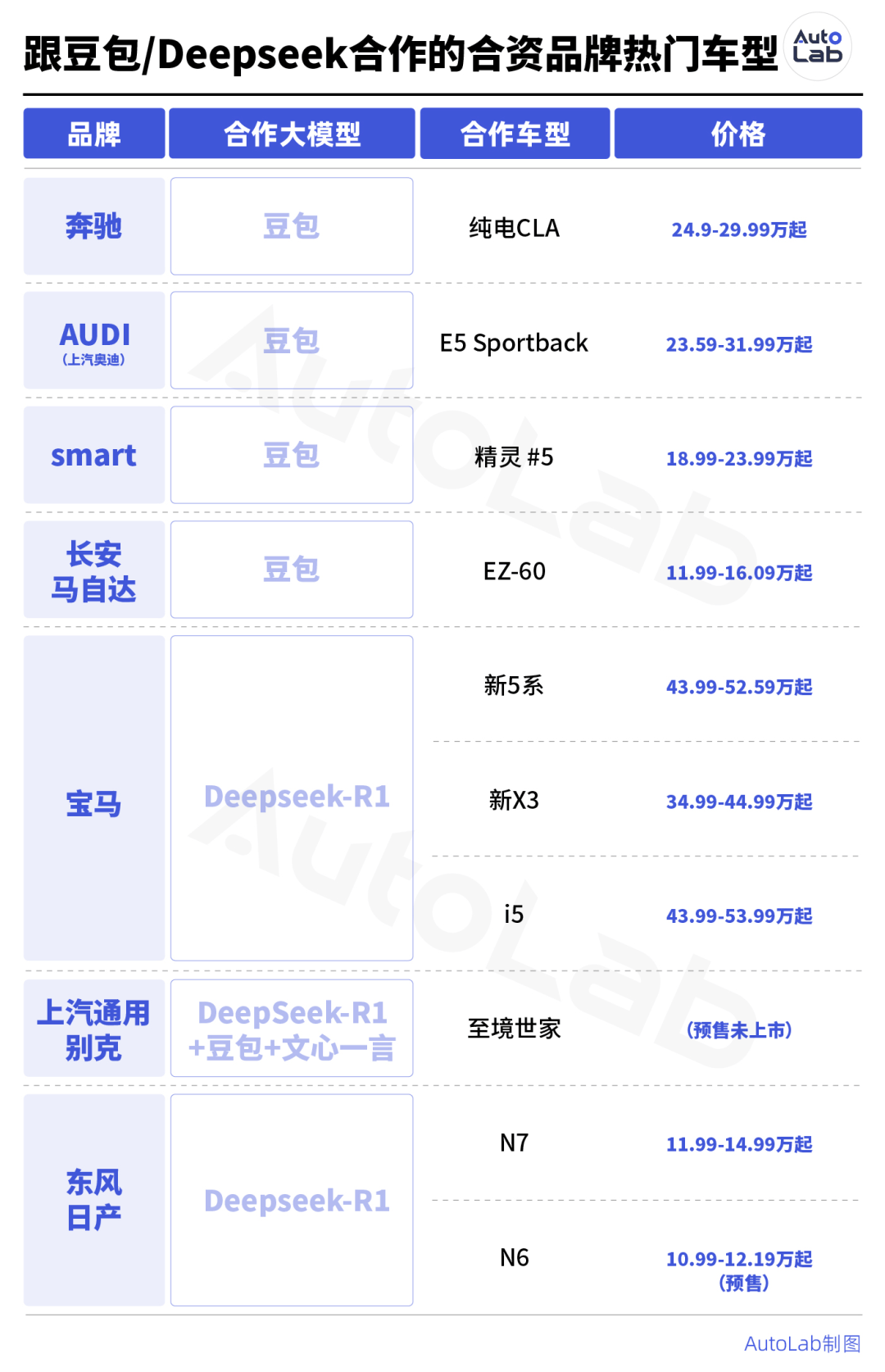 但自從豆包和DeepSeek異軍突起,并形成極高的國民度之后,合資車的語音助手簡直如同忽遇天降神兵,新車紛紛開始接入豆包或者DeepSeek。