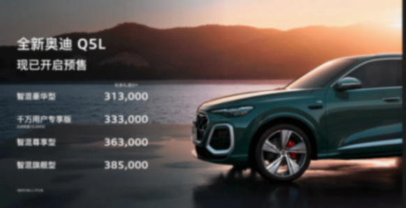 日前,全新一代奧迪Q5L已于一汽奧迪官網正式啟動預售,共推出智混豪華型、千萬用戶專享版、智混尊享型、智混旗艦型4款車型,預售價格區間為31.30萬元至38.50萬元。