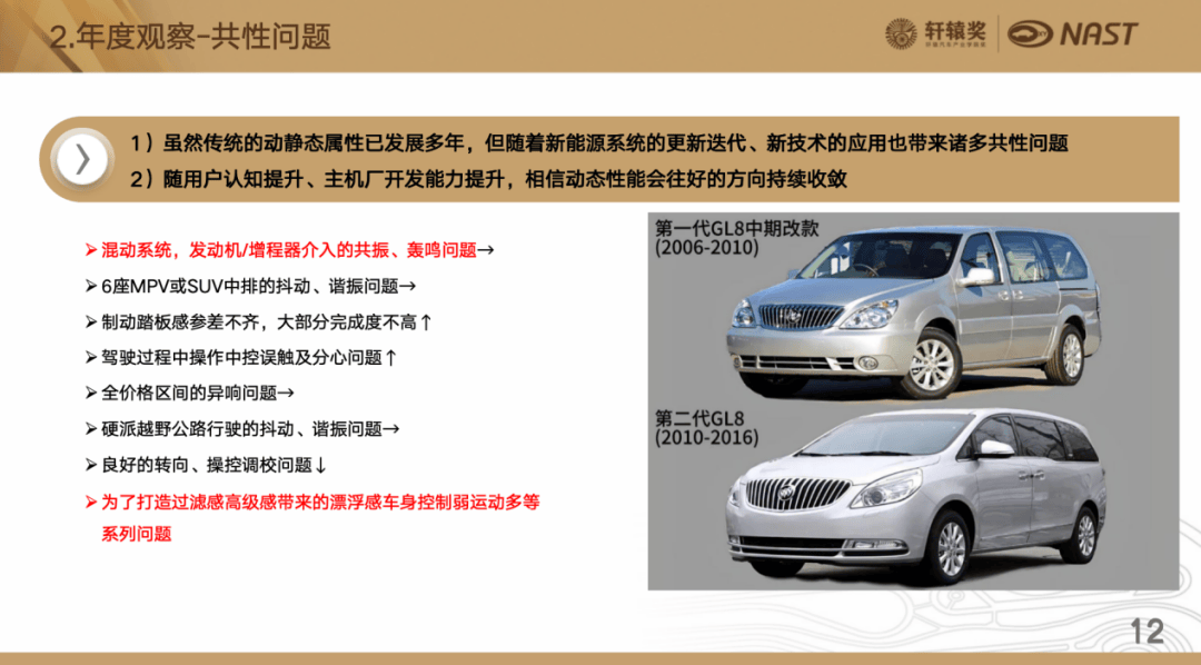 剛才我們說用戶容易感知的短板,這塊實際上也做了一些總結,前面幾點是去年就已經做了總結的,今年可能有的問題還是一直保持,有的問題這方面變薄弱了,今年有一個共性的,大家為了打造路面過濾的高級感以及舒緩運動,由此引起這個車身控制比較薄弱,車身的控制會偏弱、運動多,這個從專業角度講,可能大家不太容易理解,這個地方我舉了一個自己印象很深刻的例子。