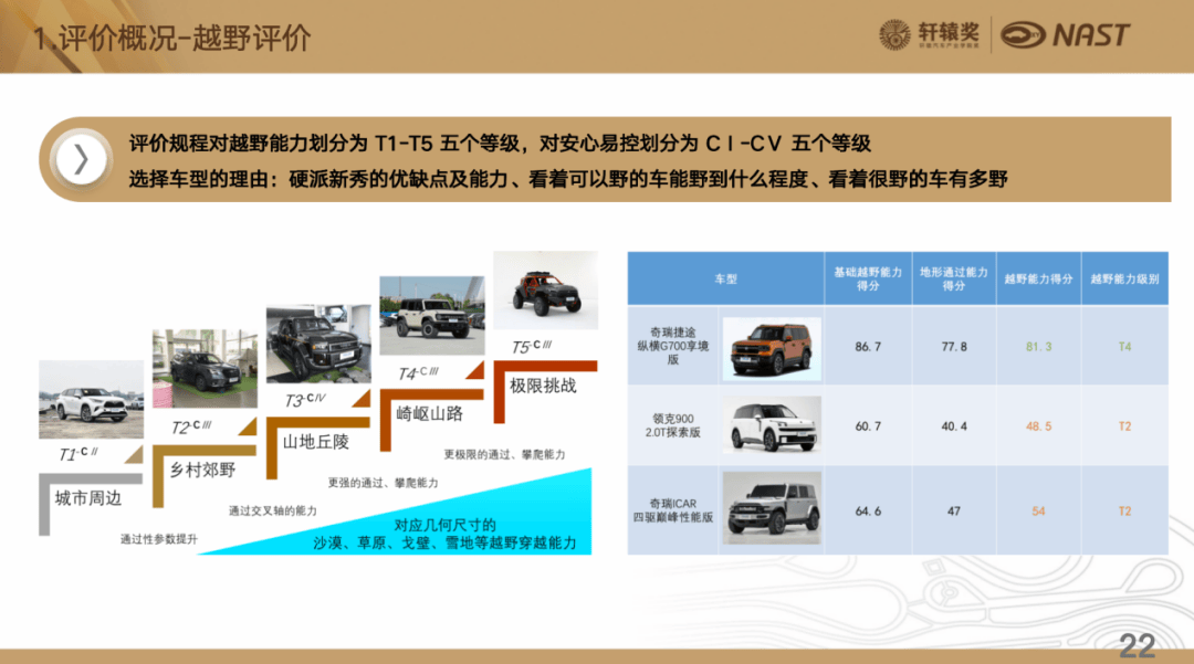 我們的評價規程也是基于中國汽車工程學會的引領性團標,加上我們21輛車的驗證,以及行業討論,最后形成評價規程,我們分別從越野能力和安心易控兩個方面去進行評價,越野能力就包括我們基礎的越野素質和地形通過能力。