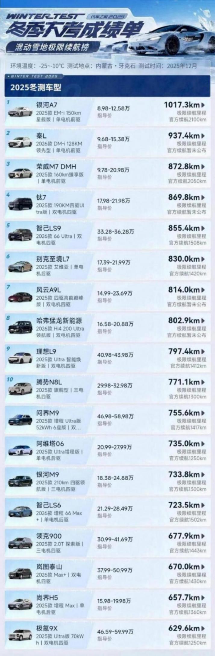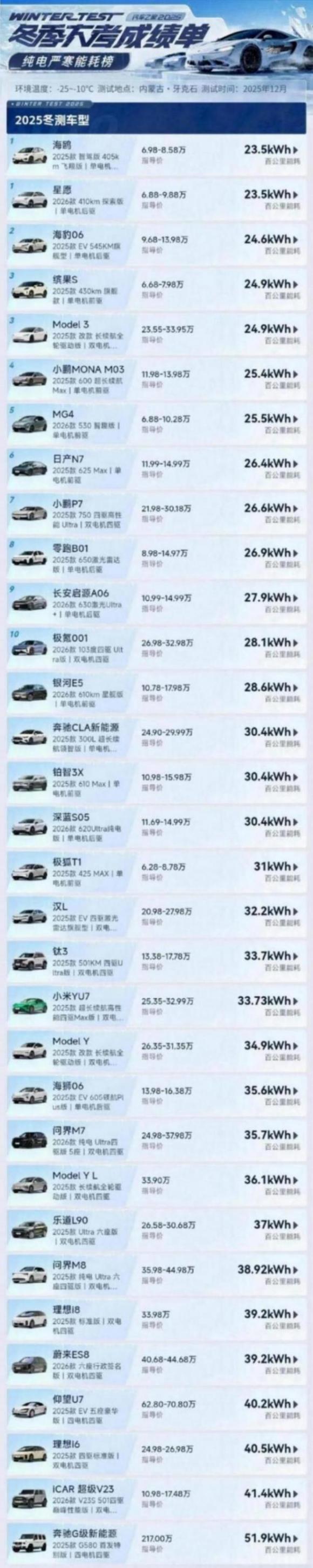 而能耗榜依然按照動力形式,分為“純電嚴寒能耗榜”和“混動嚴寒綜合成本榜”。在純電嚴寒能耗榜中,能耗最低的海鷗(前驅)和星愿(后驅)兩款純電小車,百公里能耗為23.5kWh;其次是海豹06(后驅),百公里能耗為24.6kWh;緊接著是繽果S(前驅)和Model3(四驅),百公里能耗為24.9kWh;小鵬MONA M03(前驅)百公里能耗為25.4kWh。