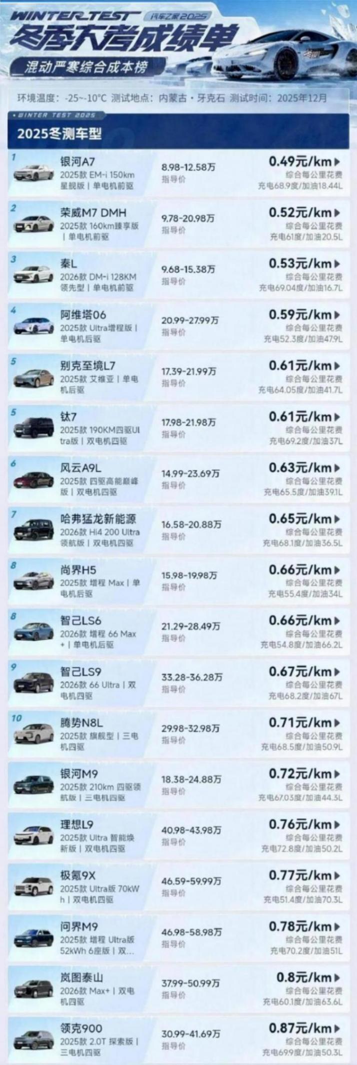 而混動嚴寒綜合成本榜中,成本最低的銀河A7(前驅),花費為0.49元/km;其次是榮威M7 DMH(前驅),為0.52/km;第三是秦L(前驅),為0.53元/km;第四是阿維塔06,為0.59元/km;第五是別克至境L7(后驅)和鈦7(四驅),均為0.61元/km。其中,鈦7(四驅)是所有測試的混動車型中,綜合每公里花費最低的車型,并且還是一款方盒子車型。