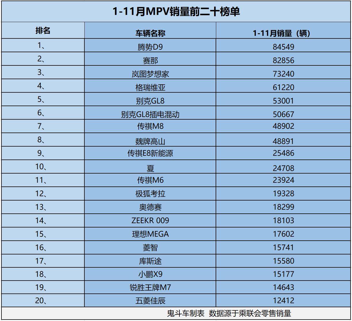 為了讓網(wǎng)友們看得更清楚,鬼哥整理出1-11月MPV銷量排名前二十榜單,數(shù)據(jù)源自乘聯(lián)會零售銷量,結(jié)果發(fā)現(xiàn),整個榜單上,沒有一款車型1-11月份累計零售銷量超過十萬輛,跟當前繁華的場面形成強烈反差。接下來,咱們聊聊具體的車型排名與銷量表現(xiàn)。