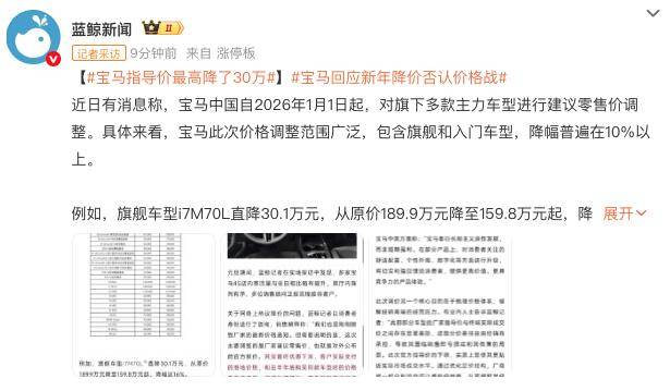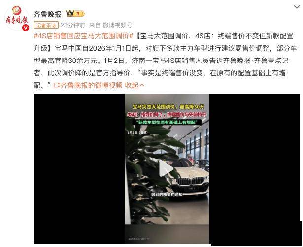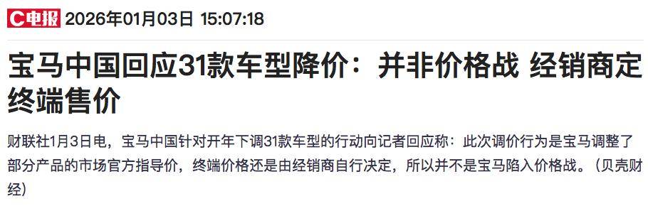針對本次調價,據《紅星資本局》等多家媒體報道,1月3日,寶馬中國回應,這不是“價格戰”,“是寶馬部分產品的價值升級,是寶馬主動調整產品策略、針對市場動態的積極回應。”
