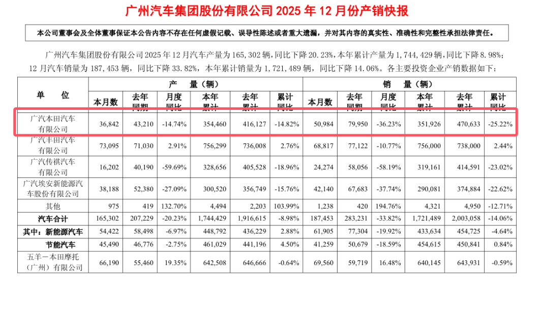 廣汽集團最新產銷快報數據顯示,2025年廣汽本田累計銷量僅351,926輛,同比下滑25.22%。從2021年算起,這家曾經的市場領跑者銷量已連續五年下滑。這是否在一定程度上彰顯了,這家昔日以“技術本田”著稱的合資企業,正面臨前所未有的市場考驗,或許是個值得觀察的課題。