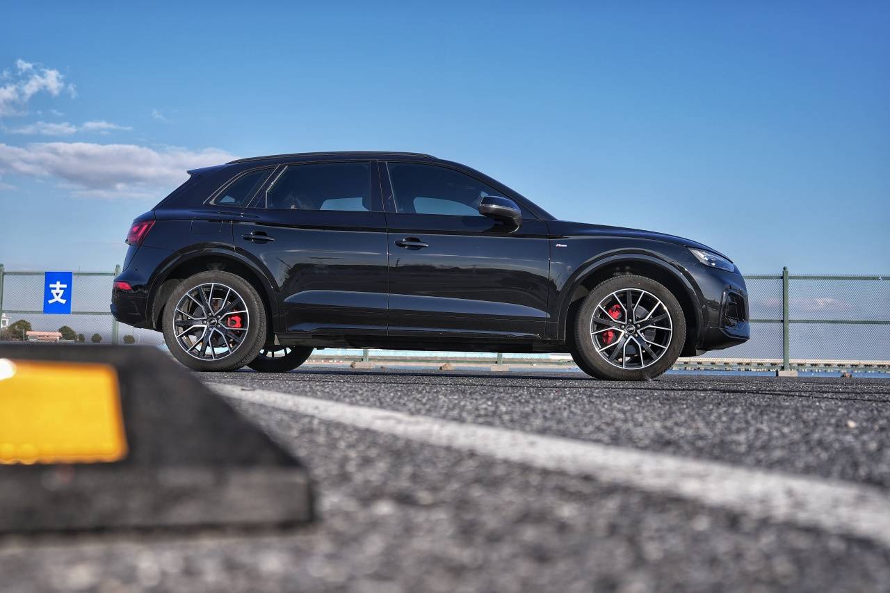 視線移至側面,那條平直銳利的腰線如刀鋒劃過車身,從日行燈眉角直直地延伸至尾燈,這是一個很好的設計點,不僅拉長了視覺感受,更賦予Q5L一種緊繃運動的張力。輪拱的弧度飽滿有力,可以容納更大尺寸的輪轂,盡管現在的輪轂造型我已經很滿意了。