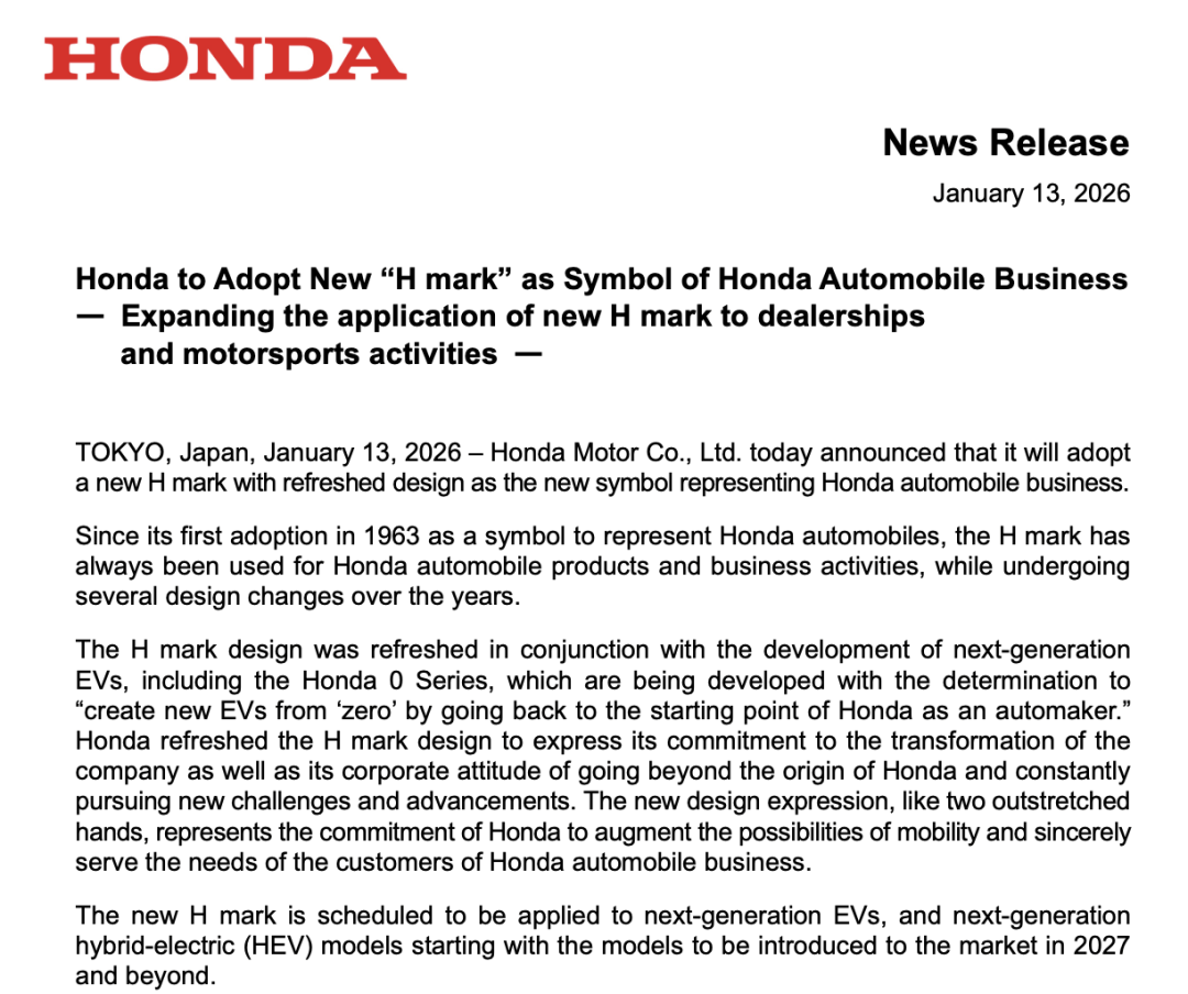 1月13日,本田汽車官宣,將采用全新設計的H標記作為代表本田汽車業務的新標志。據了解,新H標將于2027年起率先搭載于未來推出的純電動汽車和混合動力汽車的車頭與車尾,并將在旗下整車產品及全業務板塊中逐步完成切換。此外,本田將擴大使用新H標,代表本田汽車整體業務,不僅涵蓋汽車產品,還涵蓋經銷商位置、溝通舉措和汽車賽車活動等其他客戶接觸點。