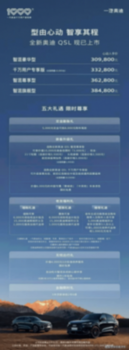 此次全新奧迪Q5L共推出4款配置車型,官方指導價區間定格為30.98-38.48萬元,同時同步推出專屬千萬用戶的尊享定制版本,以極具誠意的價格與專屬權益,回饋千萬家庭多年來的支持與信賴。為讓更多消費者享受到煥新福利,即日起至2026年3月31日,購車可尊享多重專屬禮遇,覆蓋低息金融方案、終身免費基礎保養、智駕配置升級補貼等全場景用車需求,讓每一份選擇都收獲滿滿誠意與實在優惠。