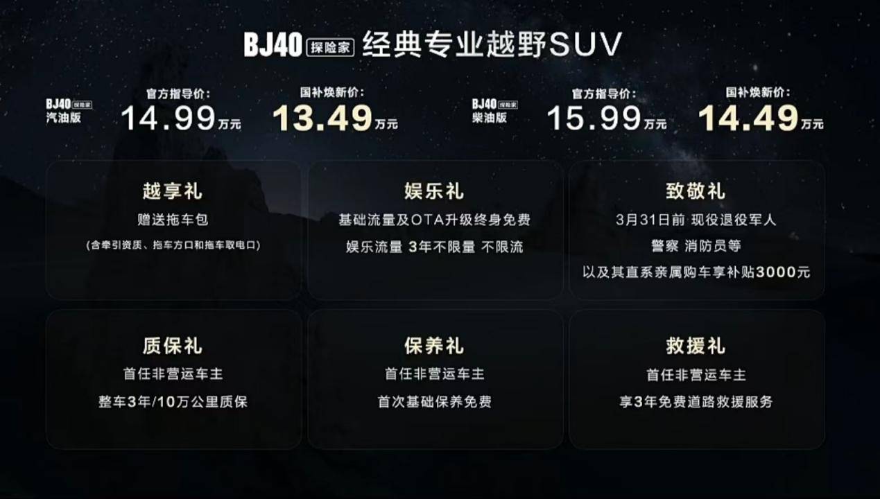 2026年開年,作為北京越野經典車型的BJ40,也帶來了新的版本。1月15日,北京越野BJ40探險家正式上市,新車共推出2款車型,包括汽油版和柴油版,官方指導價為14.99—15.99萬元,國補煥新價13.49萬元起。