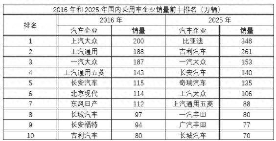 我們先來看看2016年和2025年國內乘用車銷量前十排名車企的變化情況。2016年,位居乘用車銷量前十的合資品牌有上汽大眾、上汽通用、一汽大眾、上汽通用五菱、北京現代、東風日產和長安福特共7家,合計銷量約1083萬輛,而自主品牌只有長安汽車、長城汽車和吉利汽車共3家,合計銷量約292萬輛;到2025年,位居乘用車銷量前十的合資品牌有一汽大眾、上汽大眾、上汽通用五菱、一汽豐田和廣汽豐田共5家,合計銷量約504萬輛,自主品牌有比亞迪、吉利汽車、長安汽車、奇瑞汽車和長城汽車共5家,合計銷量約954萬輛。在這分排名表上,十年時間,合資品牌的銷量占比從2015年的78.8%,下滑到2025年的34.6%,下滑幅度驚人!