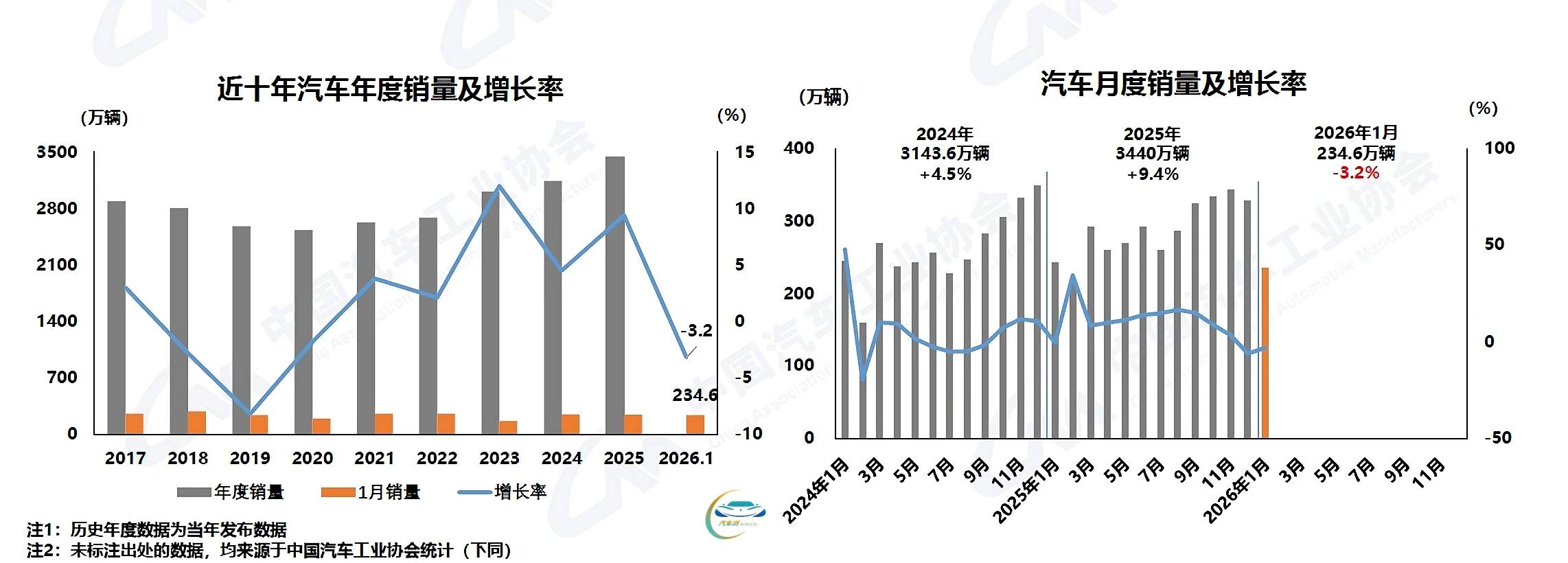 中汽協數據顯示:1月,汽車產銷分別完成245萬輛和234.6萬輛,產量同比增長0.01%,銷量同比下降3.2%,環比分別下降25.7%和28.3%。