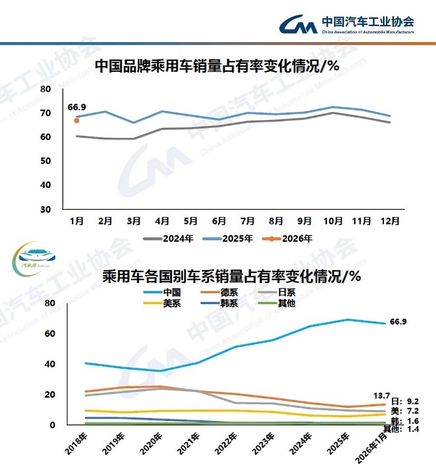當然,作為目前新能源汽車主力的中國品牌,也受到了市場調整的影響:1月銷量132.9萬輛,同比下降8.9%,市場占有率66.9%,同比下降了1.5%。