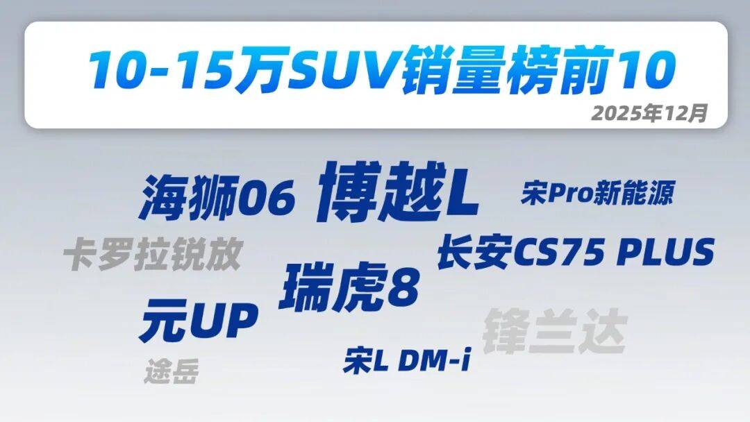 究竟有多罕見?看看2025年12月份10萬級SUV銷量表,2.4萬輛的銷量數字已經是排在“腦部”位置了。同價位的熱門燃油SUV如,月銷約1.7萬輛。