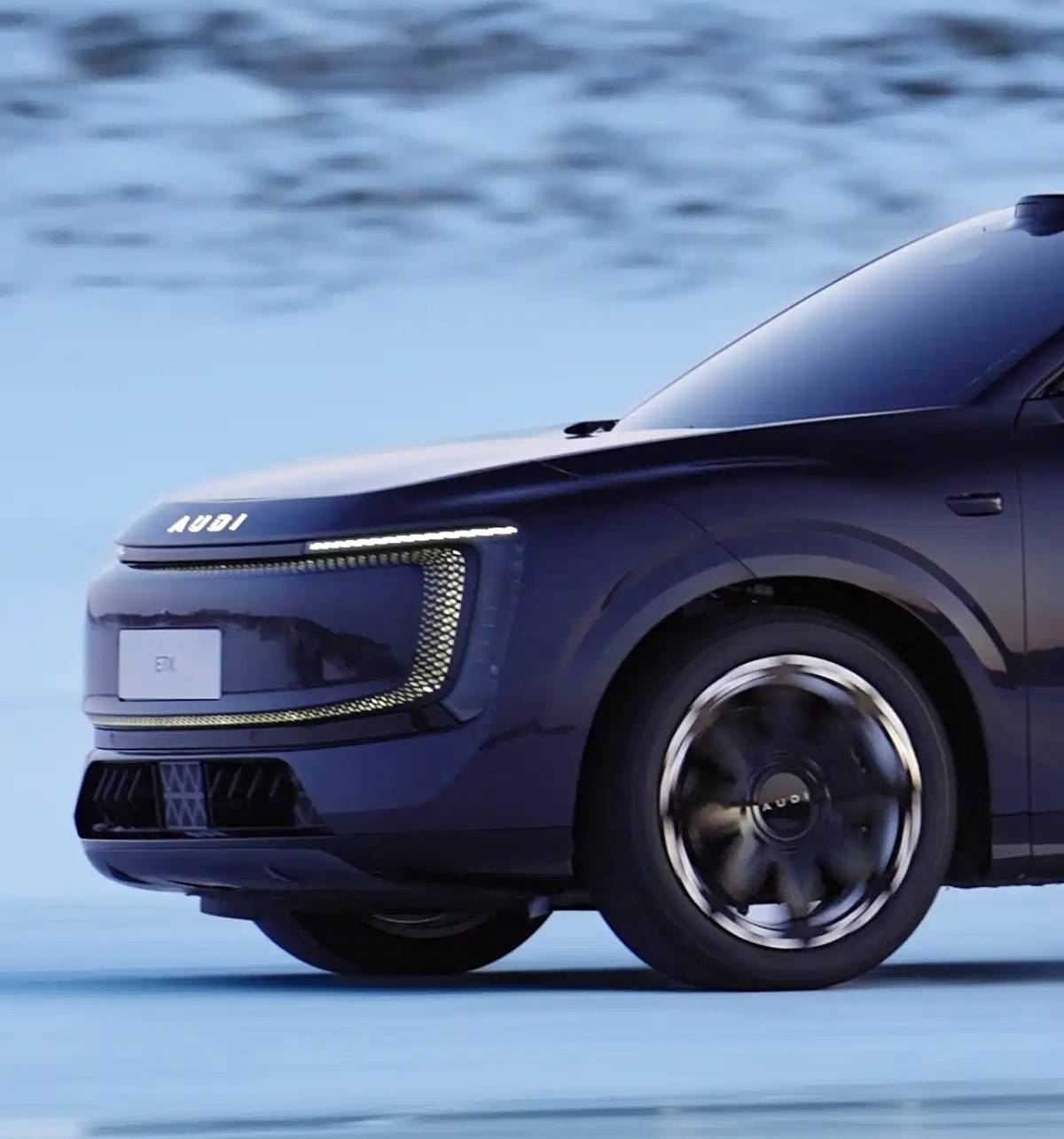 從實車圖來看,奧迪E7X前臉采用封閉式格柵設計,中央配有可發光的“AUDI”標識。格柵周圍隱藏有環繞布局的LED燈帶,呈點陣狀。日間行車燈為橫向一字造型,遠近光燈組布置在車頭兩側的縱向燈罩內。前包圍配有兩段式梯形散熱口,具備主動格柵功能。