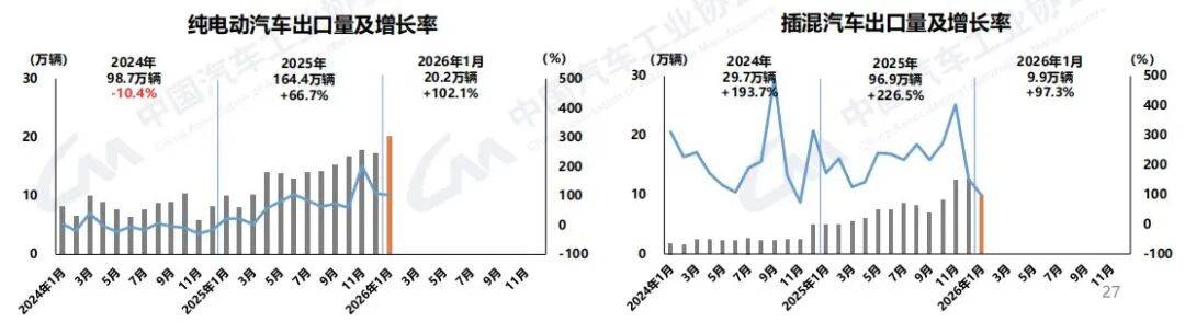 數據顯示,2024年,純電動汽車出口98.7萬輛,同比下滑10.4%;插混車出口29.7萬輛,同比增長193.7%。2025年,純電動汽車出口164.4萬輛,同比增長66.7%;插混車出口96.9萬輛,同比增長226.5%。