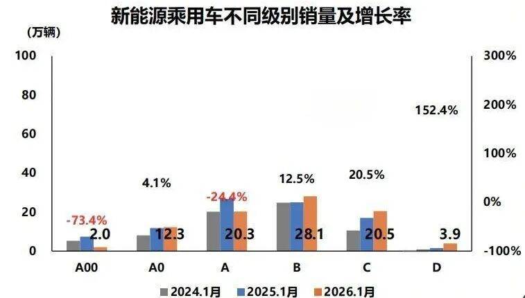 數據顯示,1月,A00級新能源乘用車銷量為2萬輛,同比下滑幅度高達73.4%;A級新能源乘用車銷售20.3萬輛,同比下滑24.4%。“2026年‘兩新’政策優化后推出,按照車型售價比例給予補貼優惠,對于價格較低的車型影響比較大。”陳士華指出,從1月份乘用車銷量數據也可看出整體車市變化趨勢,乘用車25萬元以上價格區間市場中新能源車好于傳統燃料車。