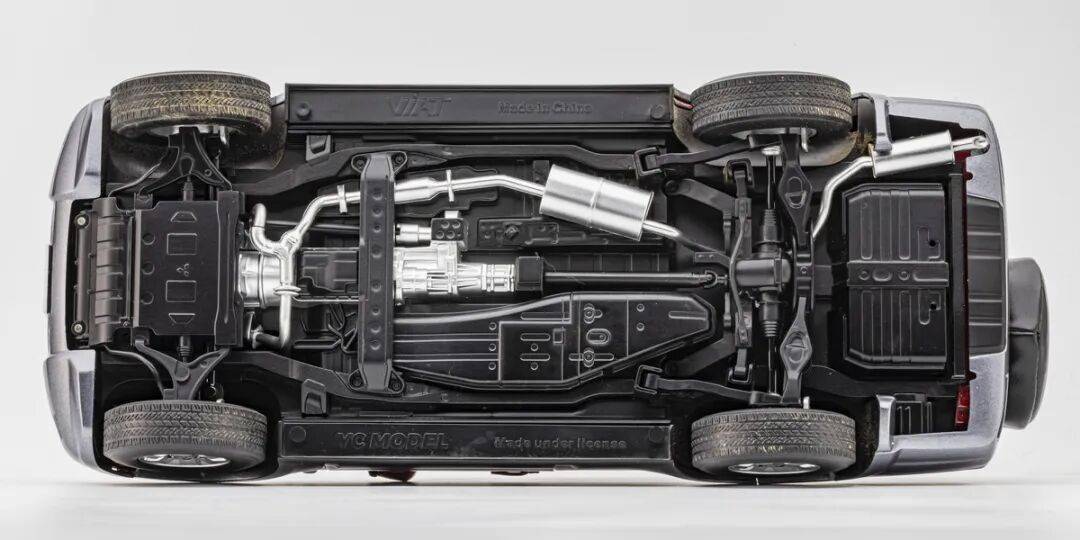 模型的底盤做了彈簧懸掛功能,細節方面分件比較多,包括轉向結構、懸掛結構、傳動結構等都做了分件,排氣系統還租了電鍍分色。模型的后輪還做了軸聯動;整體上看YC的這款V73底盤細節還算豐富,這也是越野車模型的特點之一。