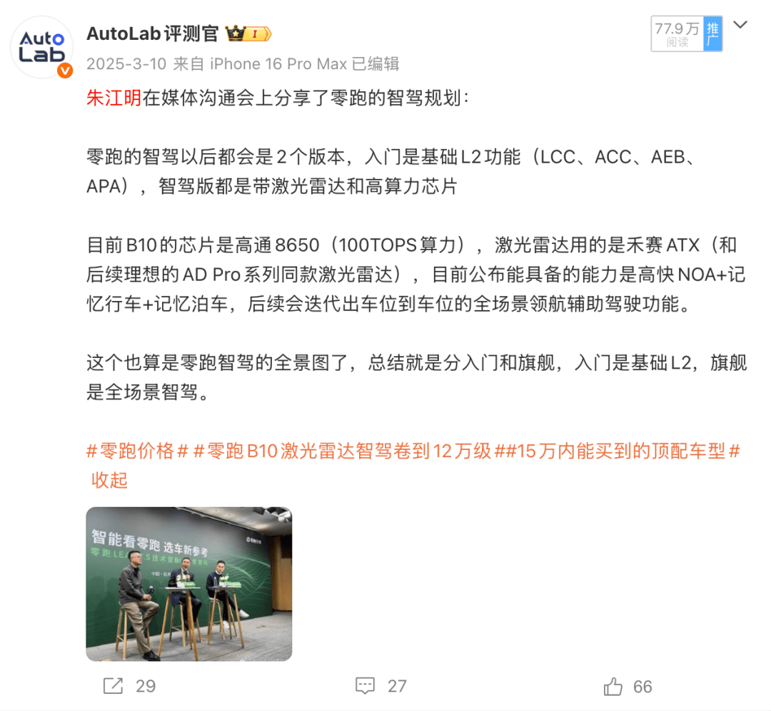 就比如零跑B10激光雷達(dá)版,它雖然有激光雷達(dá),但目前只支持高速領(lǐng)航、通勤領(lǐng)航等功能,真正的城區(qū)領(lǐng)航或者車位到車位還需要等后續(xù)的OTA。