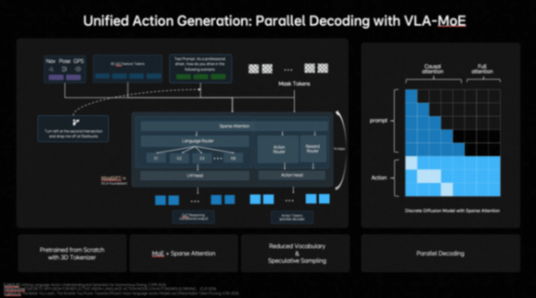 在行為層面,理想汽車構(gòu)建了統(tǒng)一行為生成(Unified Action Generation)機(jī)制。首先,MindVLA-o1使用VLA-MoE(混合專家模型)架構(gòu),并引入專門的Action Expert(動(dòng)作專家),從3D場(chǎng)景特征、導(dǎo)航目標(biāo)、駕駛指令等多維輸入中提取信息,并結(jié)合多模態(tài)思考生成高精度駕駛軌跡。其次,為滿足實(shí)時(shí)性要求,系統(tǒng)采用并行解碼(Parallel Decoding),同時(shí)生成所有軌跡點(diǎn),大幅提升效率。最后,引入Discrete Diffusion(離散擴(kuò)散)進(jìn)行多輪迭代優(yōu)化,類似逐步去噪,確保軌跡空間連續(xù)、時(shí)間穩(wěn)定,并符合車輛動(dòng)力學(xué)約束。形成統(tǒng)一行為生成機(jī)制,使模型行得更穩(wěn)。