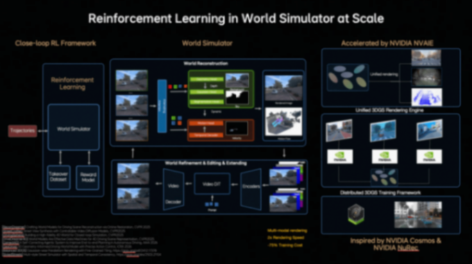在模型迭代層面,理想汽車構(gòu)建了閉環(huán)強(qiáng)化學(xué)習(xí)框架,讓模型不僅能從真實(shí)數(shù)據(jù)學(xué)習(xí),還能在世界模擬器(World Simulator)中持續(xù)探索和優(yōu)化策略。為此,理想汽車將傳統(tǒng)逐步優(yōu)化式重建升級(jí)為Feed-forward(前饋)場(chǎng)景重建,使系統(tǒng)能夠瞬時(shí)生成大規(guī)模、高保真駕駛場(chǎng)景,支持大規(guī)模并行訓(xùn)練。同時(shí),結(jié)合生成式模型(Generative Models),模擬環(huán)境可擴(kuò)展、編輯并生成全新場(chǎng)景。為支持大規(guī)模模擬與訓(xùn)練,理想汽車開發(fā)了統(tǒng)一的3D Gaussian Splatting(3D高斯?jié)姙R)渲染引擎和分布式訓(xùn)練框架,渲染速度提升近2倍,整體訓(xùn)練成本降低約75%,實(shí)現(xiàn)低成本、高效率的強(qiáng)化學(xué)習(xí)閉環(huán)。在閉環(huán)強(qiáng)化學(xué)習(xí)框架下,模型實(shí)現(xiàn)更快進(jìn)化。