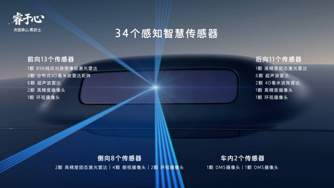 在與華為乾崑的深度優勢互補下,嵐圖泰山Ultra及黑武士搭載了華為目前最新的乾崑ADS V4.1激光雷達方案,配備了包括激光雷達,高清攝像頭、毫米波雷達、超聲波雷達在內共計34顆高精度傳感器,構建起全場景無死角的感知網絡,為高階智能輔助駕駛決策提供可靠依據。尤其核心的全球量產最高規格896線雙光路圖像級激光雷達,相比傳統192線激光雷達,896線激光雷達實現了斷層領先,針對30cm高度障礙物最遠識別距離高達162米,針對14cm小目標也能實現120米遠距識別,真正實現了從“點云級”到“圖像級”的跨越,是目前行業感知硬件的“天花板”。