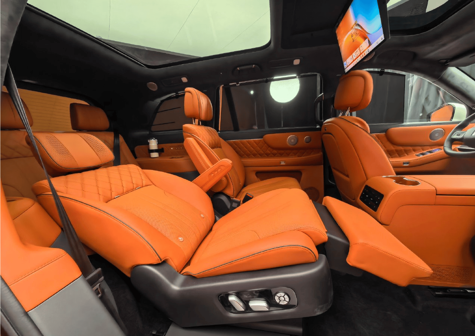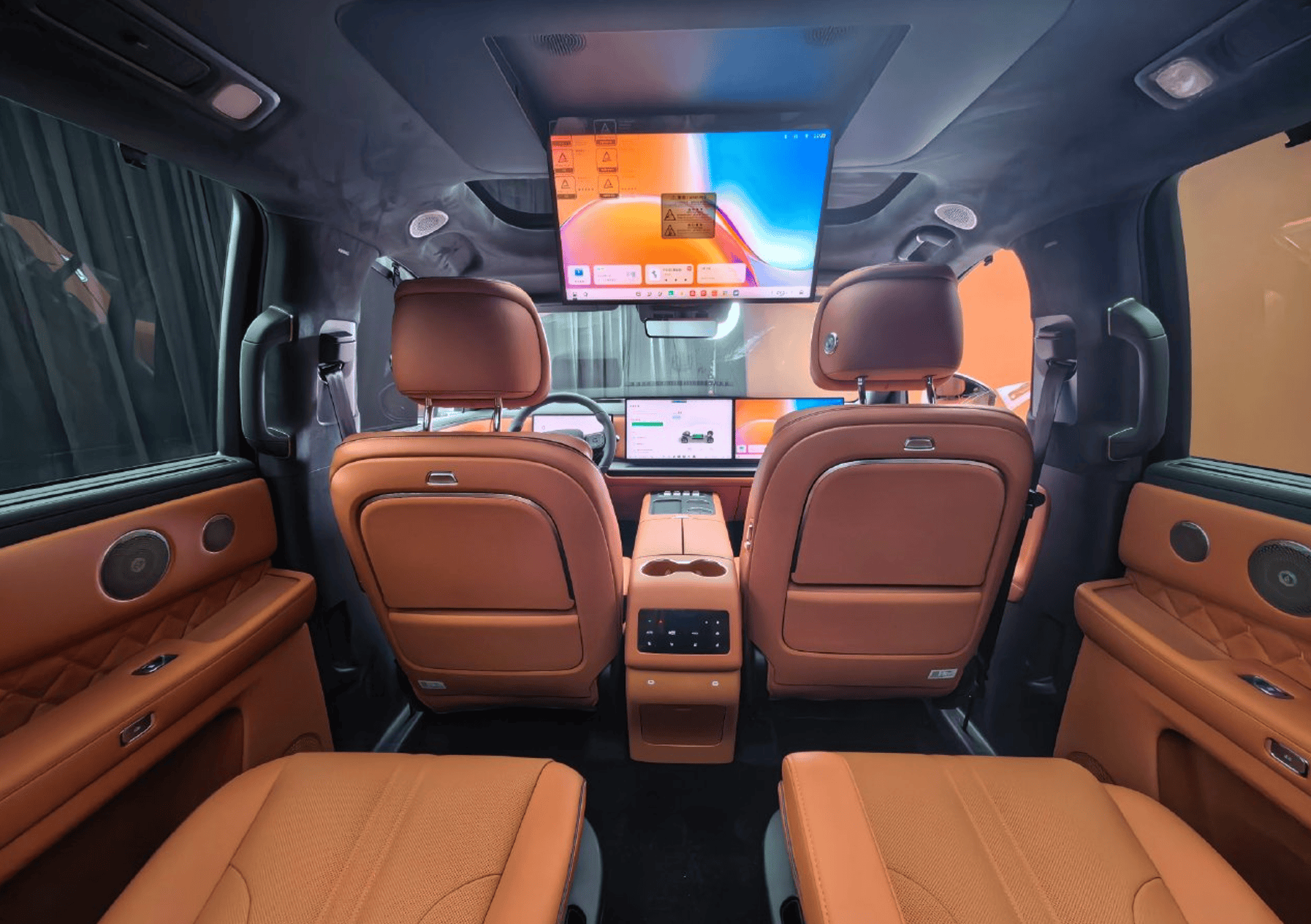 車內采用2+2+2式的六座布局,二排右側為零重力座椅,支持通風/加熱/按摩等功能,再配合21.4英寸4K吸頂娛樂屏、折疊小桌板、31揚Coffee AlSound音響系統以及雙天幕等,乘坐舒適性不言而喻。而第三排座椅也支持電動調節、加熱功能,放倒后還能進一步提升實用空間。此外細節方面,副駕及二排門板上均配備50W手機無線充電,一二三排均有遮陽簾,并具備靈活座椅布局。