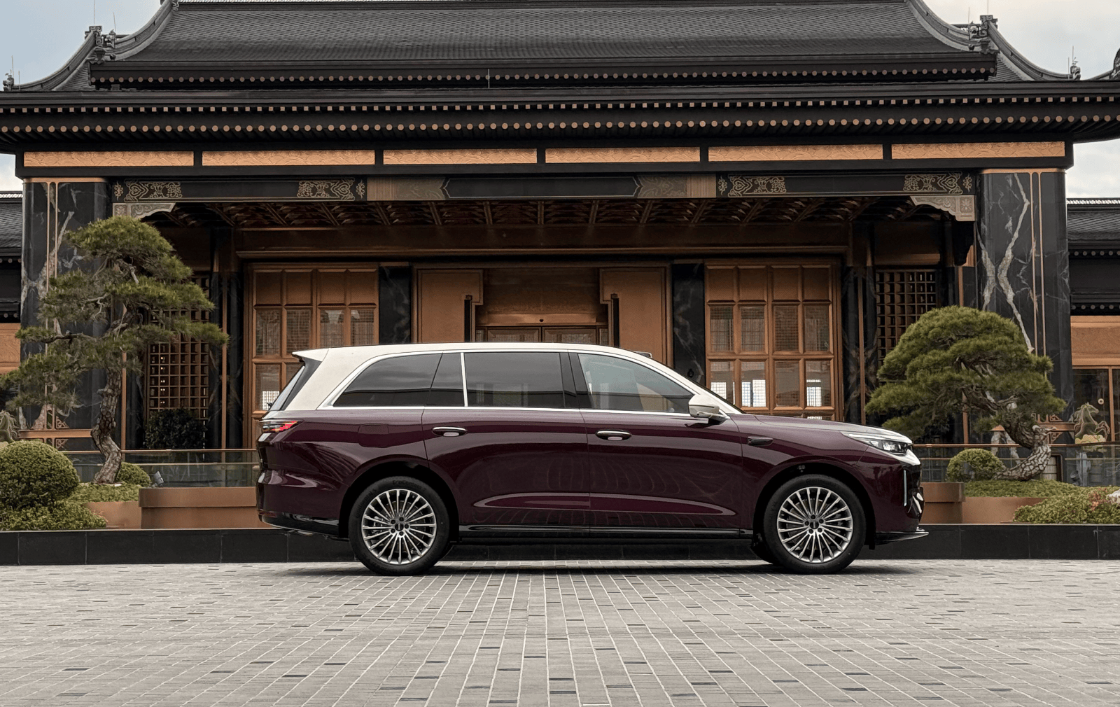 車身尺寸長寬高分別為5299/2025/1825mm,軸距3150mm,相比極氪9X、問界M9更大一些。龐大的身軀配合方正飽滿的輪廓,給人感覺很有氣場,而紫闕鎏金、黑玄曜金兩種雙拼色,配合細節處鍍鉻飾條點綴、21英寸密幅式輪轂等,也進一步提升了豪華氣息。另外還將配備“矩陣疊影”尾燈、電吸門、電動踏板等,還提供文淵黑、影壁灰、月華銀、天華綠、丹宸紫,5種單色可選。