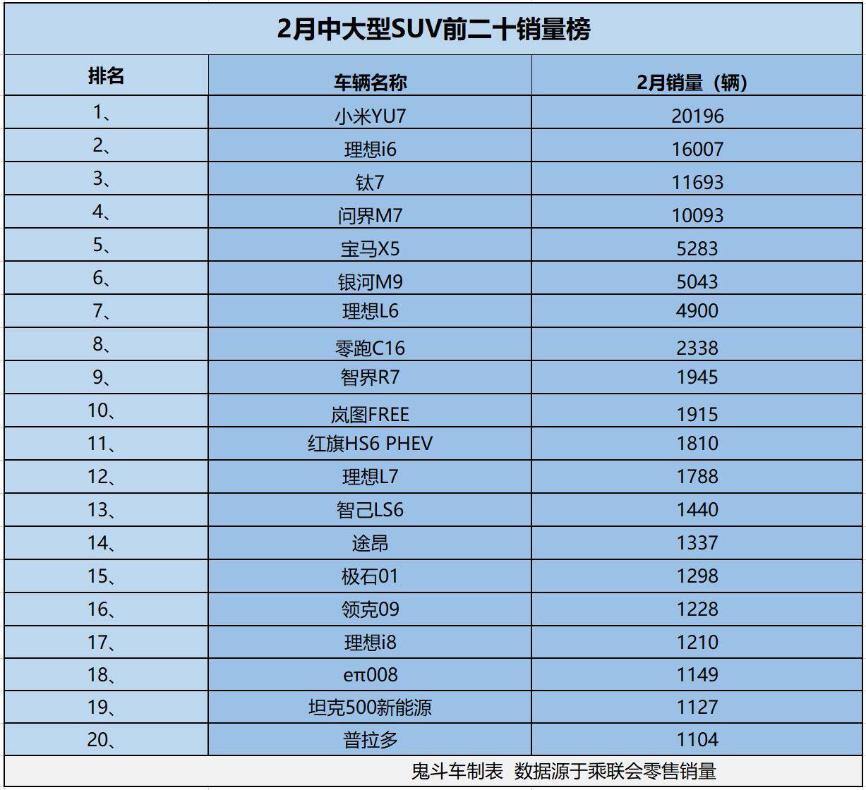 寶馬X5排名第五位,2月零售銷量達到5283輛,現在,很多新勢力公開叫板德系豪華,可它們依然有著自己的粉絲群體。銀河M9排名第六位,2月零售銷量達到5043輛,這款車型的銷量表現也不錯,跟對手相比,這款國產中大型SUV的性價比優勢更明顯。